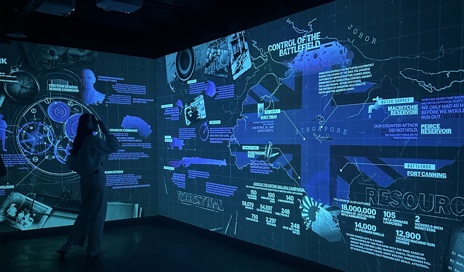 We brought the client’s vision for an engaging experience to life at Battle Box. Singapore. Combining history with technology, guests would embark on a 40-minute audio tour through the chambers, encountering key moments leading to the British surrender. Two immersive rooms further enriched the experience: “The Day Before” used stunning projections to transport guests back in time, while “The Moments Before” offered a unique perspective on the battle through special glasses. This multi-sensory journey fostered a deeper understanding of this significant historical event.